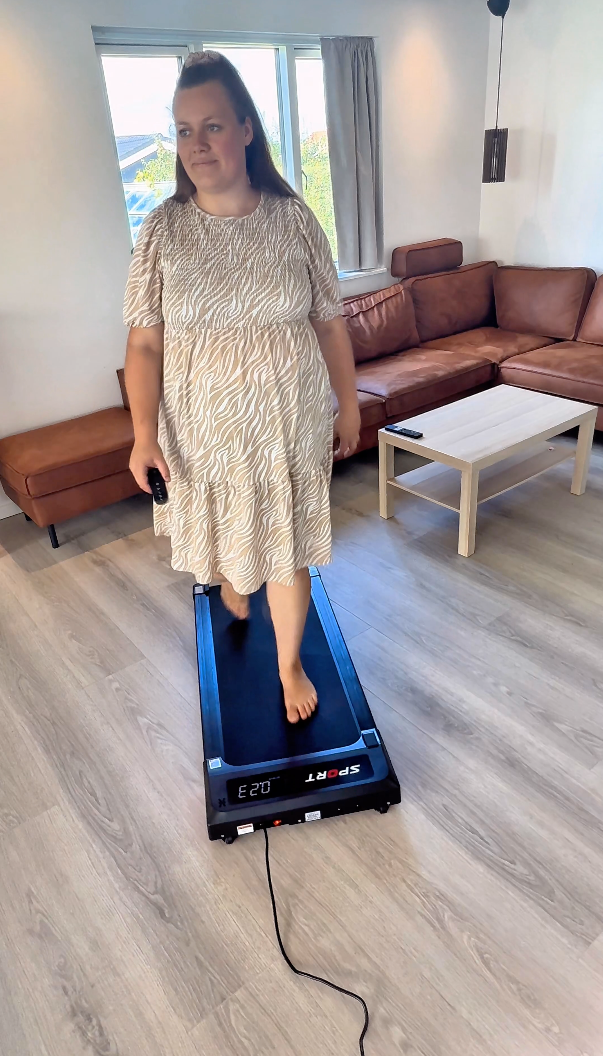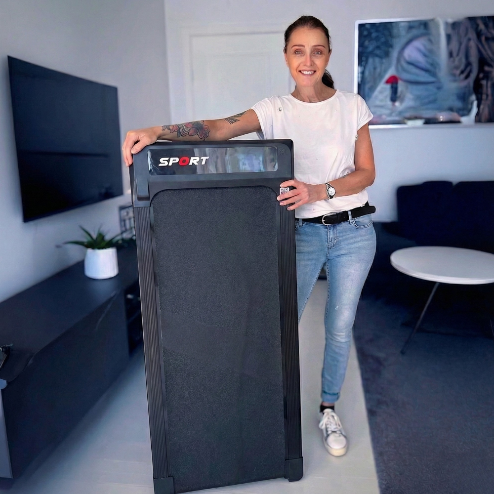 Den er perfekt til at placere foran dit TV eller skrivebord, så du kan gå en tur, mens du ser din yndlingsserie eller arbejder. Med den praktiske telefonholder kan du nemt følge med på skærmen – en enkel måde at få motion ind i din dag uden at gå på kompromis med underholdningen.